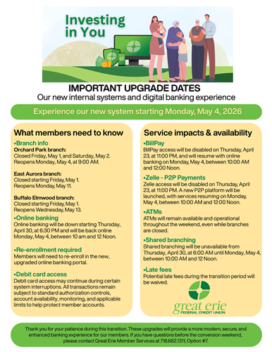 Great Erie is upgrading both our core banking system and digital banking platform this spring.